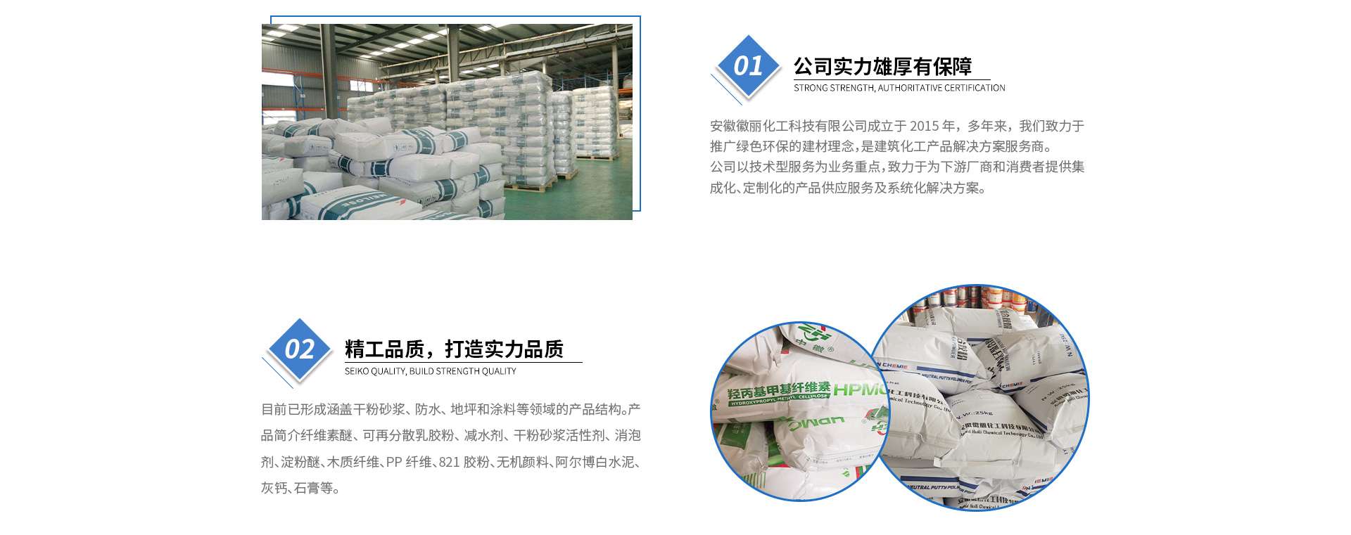 合肥徽麗環保建材有限公司是安徽省一家專業從事銷售化工建材產品及添加劑的企業。公司擁有超前的科研技術,以及實踐經驗豐富的人才。是一個銷售技術服務為一體的高新技術企業。公司始終秉承“勇于承諾,敢于擔當”的企業價值觀和“誠實守信,仁愛共贏”的經營理念。